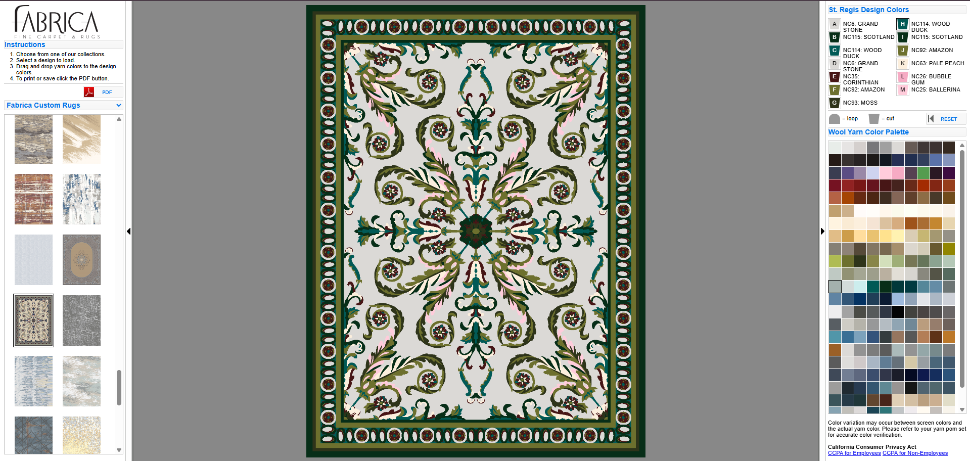 Go to the button below and select which custom rug patterns they have available. You can either drag colors from their color palette to the area of the rug you want to change colors or click on the color-coordinating alphabetized box above the palette to see what colors are corresponded with what letter to change those colors. Once you have completed your design, download the rug as a .pdf file by clicking on the PDF button towards the top left corner. Print the design or email the file to info@bonsaiflooring.com so we can get more information, such as pricing, over to you as soon as possible.