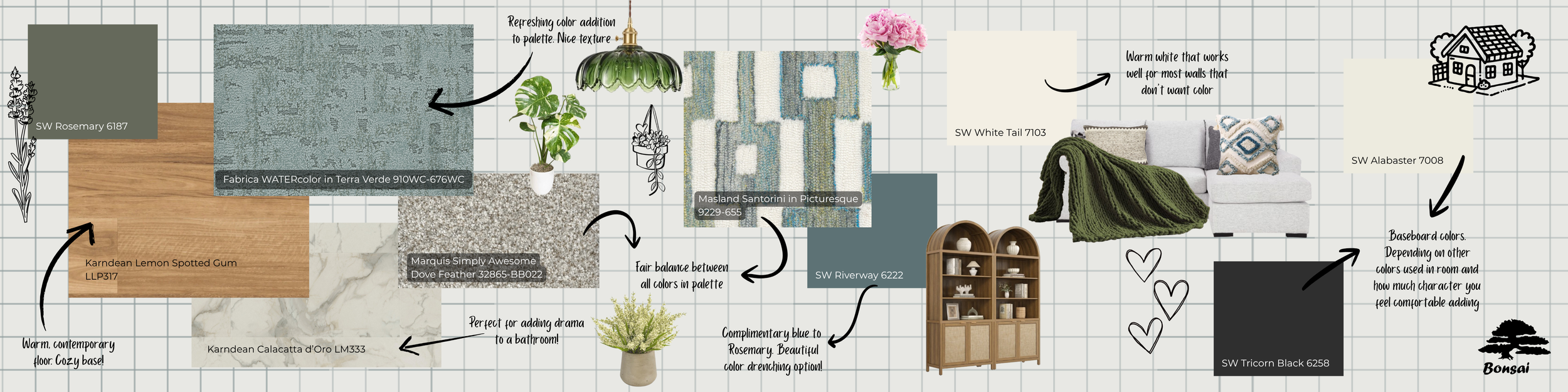 As for the paint colors, the palette is centered around Sherwin William’s Rosemary. This color would be used as a color drenching option for a room, an accent wall, cabinets, furniture, and most other surfaces. Plants would work well with bringing the earthy-green tones to other spaces as well, tying Rosemary into other rooms that are a different color entirely. As a complimentary color to the Rosemary, Riverway also behaves the same way, working great for most surfaces. If you are not looking for a lot of color and want to use it sparingly for your space, White Tail is a fantastic color to use in nearly every room of the house. White Tail is a warm white that works wonderfully with Rosemary and Riverway, as well as move the warmth offered by the flooring options upwards into the space. Even the less warm tones, closer to cool tones, found in Calacatta d’Oro or Dove Feather work well with White Tail. Finally, for baseboard options, we have Tricorn Black for those spaces that are begging for extra drama to be added and Alabaster for those trim pieces that want to blend into the wall. Tricorn Black may feel daunting at first, but we think it would work well in a space like a hallway, where you want to have a stark contrast between the baseboards, door frames, and the door itself from the wall. If the walls are painted White Tail in the hallway, the Tricorn Black will look absolutely stunning!